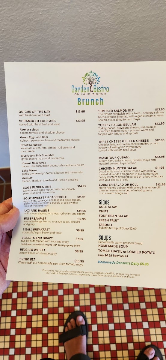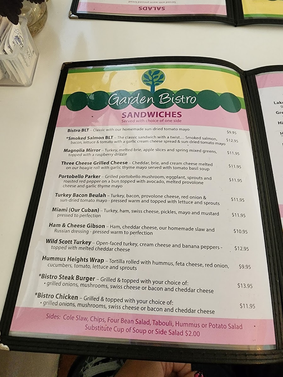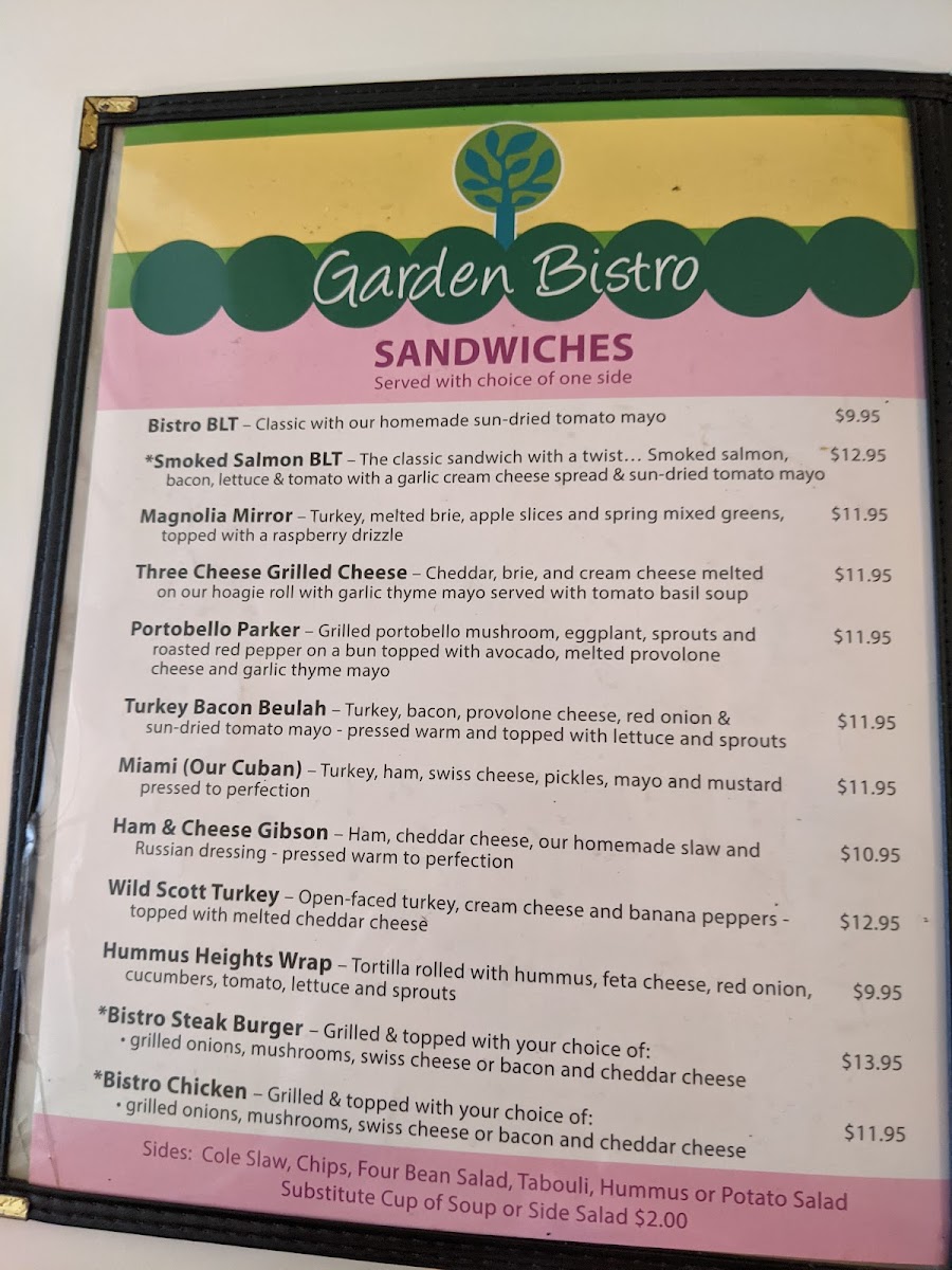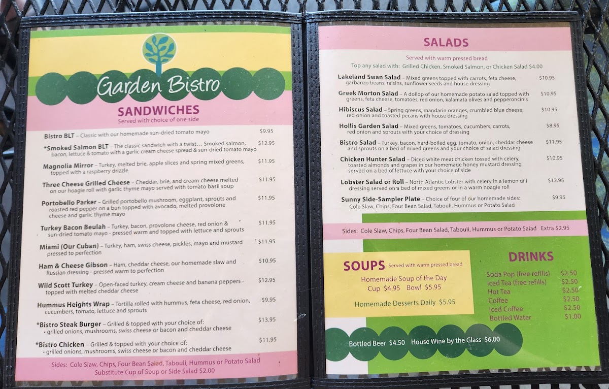 At Garden Bistro, located at 702 E Orange St, Lakeland, FL, this menu offers a delightful variety of dishes that reflect a perfect balance of fresh ingredients and bold flavors. Whether you're in the mood for a light bite or a hearty meal, there's something here for everyone. From savory appetizers to satisfying mains, the options are both comforting and exciting. The Bistro's menu celebrates seasonal ingredients, carefully curated to ensure every dish is a treat for the taste buds. Vegetarians and meat-lovers alike will find plenty of choices to savor, with each plate thoughtfully crafted to offer a memorable dining experience. With a relaxed atmosphere, it’s the perfect spot for enjoying quality food with great company.